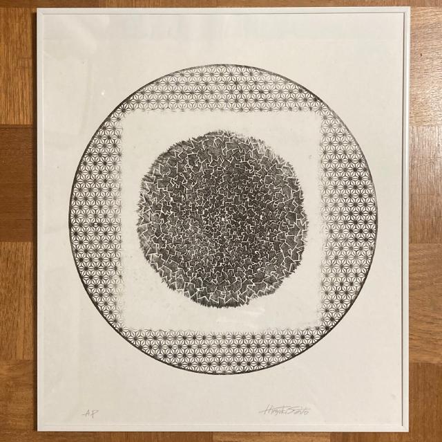 3Dプリンターで伝統模様が彫られた板の、その板の中央にガレキを彫って制作した版画作品です。規則正しいデザインと、不規則不連続のアートを融合しました。